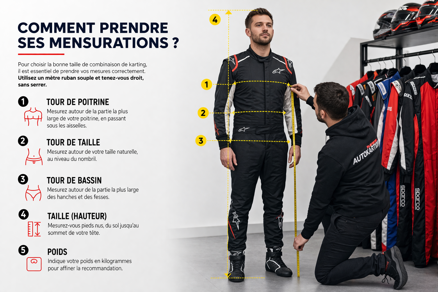 La taille est probablement le critère le plus important. Une combinaison de karting se choisit à partir de plusieurs mesures, et pas seulement avec votre taille en centimètres. Pour faire un choix cohérent, il faut idéalement croiser votre taille, votre poids, votre tour de poitrine, votre tour de taille et votre tour de bassin.